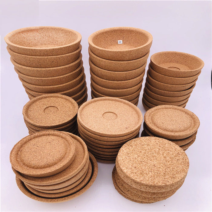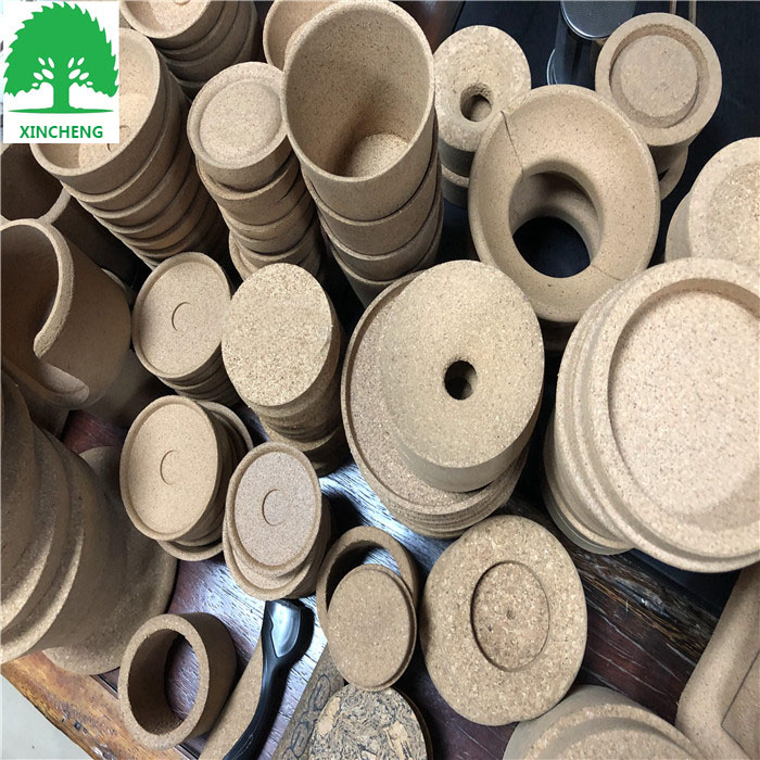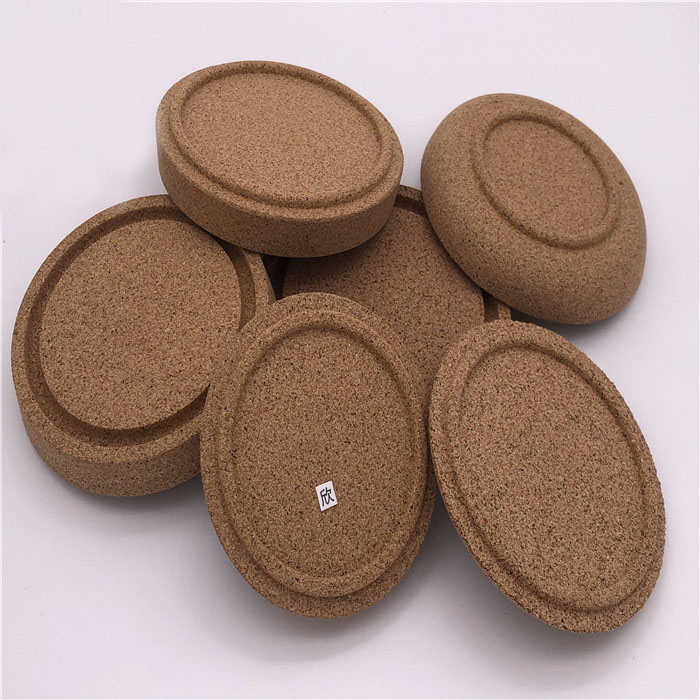 用天然软木粒加聚氨酯胶搅拌均匀,放入定型模具经过热压,高温烘焙定型、养生、脱模、修边、打磨等工序加工成型,